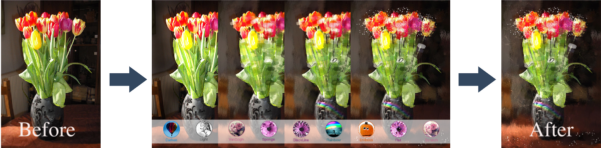 Tipix与目前大多数美图类应用不同,她融合了多种图像处理算法,用户只需选取笔刷,指尖涂抹,短时间就能将平淡无奇的照片变成大师级、个性化的艺术作品。满足人们对美育、艺术创作的需求,Tipix也为当前弘扬美育教育但缺乏教育工具的背景下提供一个免费、便捷、实用、趣味的艺术培养工具而努力。